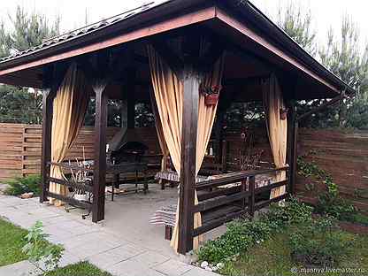 Легкие шторы, занавески особенно уместны в открытых навесах. Для изготовления этих элементов рекомендуется использовать ткани изо льна или хлопка. Поднимут настроение зеленые и оранжевые цвета. При малиновом, бирюзовом или фиолетовом оттенке, оформление придаст атмосферу загадочности.